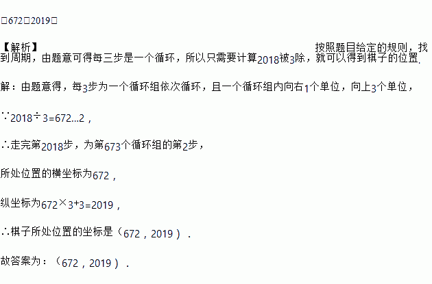 在平面直角坐标系中,智多星做走棋的游戏,其走法是:棋子从原点出发,第1步向上走1个单位,第2步向上走2个单位,第3步向右走1个单位,第4步向上走1个单位……依此类推,第n步的走法是:当n被3除,余数为2时,则向上走2个单位;当走完第2018步时,棋子所处位置的坐标是_____