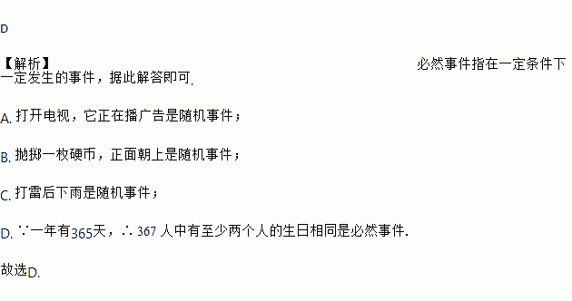 C. 打雷后下雨 D. 367 人中有至少两个人的生日相同