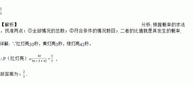 某十字路口设有交通信号灯,东西向信号灯的开启规律如下:红灯开启30秒后关闭,紧接着黄灯开启3秒后关闭,再紧接着绿灯开启42秒,按此规律循环下去.如果不考虑其他因素,当一辆汽车沿东西方向随机地行驶到该路口时,遇到红灯的概率是__________.