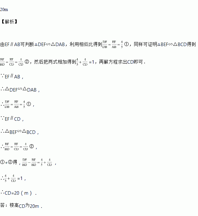 如图所示,站在楼房AB的楼顶A处望楼房CD的底部D,视线刚好过小树EF的顶端E;又从楼房AB的底部B处望楼房CD的楼顶C,视线也刚好过小树EF的顶端E,经测量得AB=5 m,EF=4 m.求楼房CD的高.