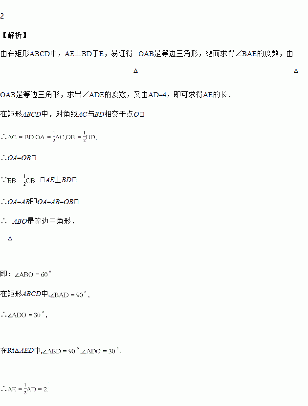 在矩形ABCD中,AD=4,对角线AC与BD相交于点O,过点A作AE⊥BD,垂足E为,EB=OB,求AE的长.