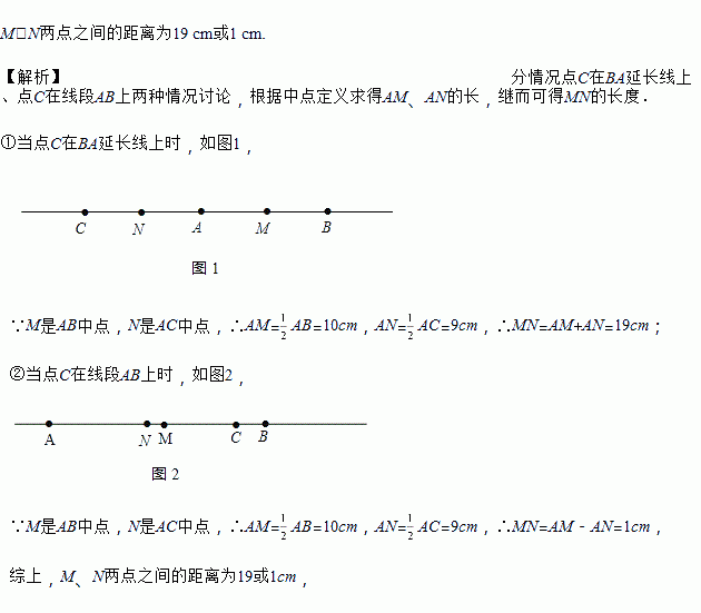 在一条直线上任取一点A,截取AB=20 cm,再截取AC=18 cm,M,N分别是AB,AC的中点,求M,N两点之间的距离.