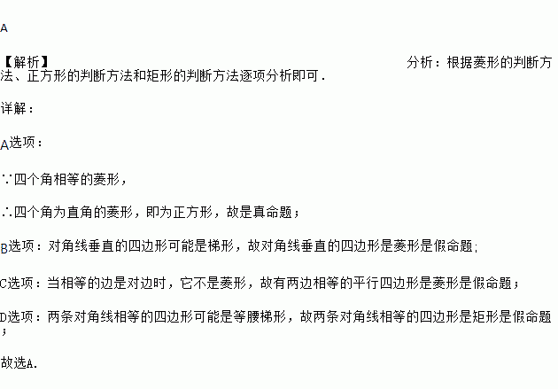 A. 四个角相等的菱形是正方形 B. 对角线垂直的四边形是菱形