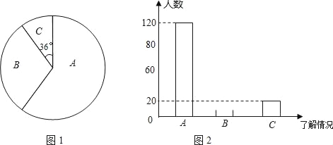 “精准扶贫”这是新时期党和国家扶贫工作的精髓和亮点.某校团委随机抽取部分学生,对他们是否了解关于“精准扶贫”的情况进行调查,调查结果有三种:A、了解很多;B、了解一点;C、不了解.团委根据调查的数据进行整理,绘制了尚不完整的统计图如下,图1中C区域的圆心角为36°,请根据统计图中的相关的信息,解答下列问题: