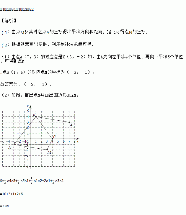 (2)在(1)的条件下,若点C的坐标为(4,0),请在图中描出点N并顺次连接BC,CM,MN,NB,然后求出四边形BCMN的面积S.