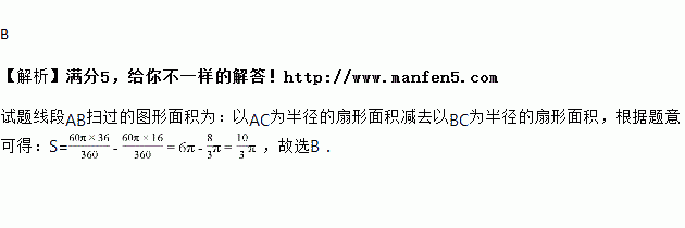 如图,将△ABC绕点C旋转60°得到△A′B′C,已知AC=6,BC=4,则线段AB扫过的图形的面积为( )