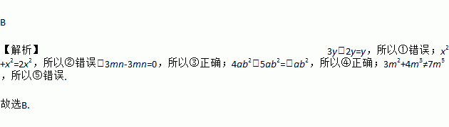 B 【解析】3y-2y=y,所以①错误;x2+x2=2x2,所以②错误;3mn-3mn=0,所以③正确;4ab2-5ab2=-ab2,所以④正确;3m2+4m3≠7m5,所以⑤错误. 故选B.