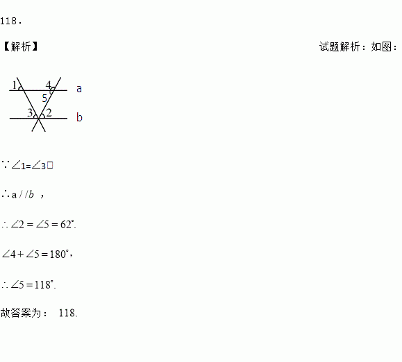 如图,已知∠1=∠2=∠3=62°,则∠4=______度.