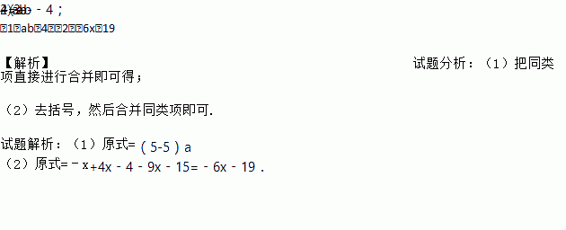 (1)5a2+3ab﹣4﹣2ab﹣5a2; (2)﹣x+2(2x﹣2)﹣3(3x+5)
