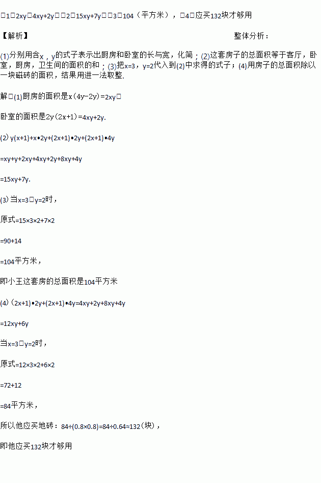 (1)写出用含x、y的代数式表示厨房的面积是________ m2;卧室的面积是________ m2;