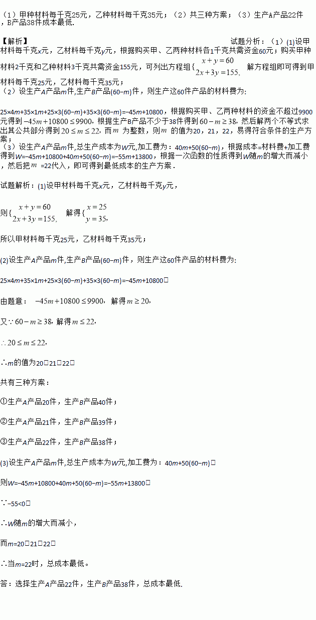 (3)在(2)的条件下,若生产一件A产品需加工费40元,若生产一件B产品需加工费50元,应选择那种生产方案,使生产这60件产品的成本最低?(成本=材料费+加工费)