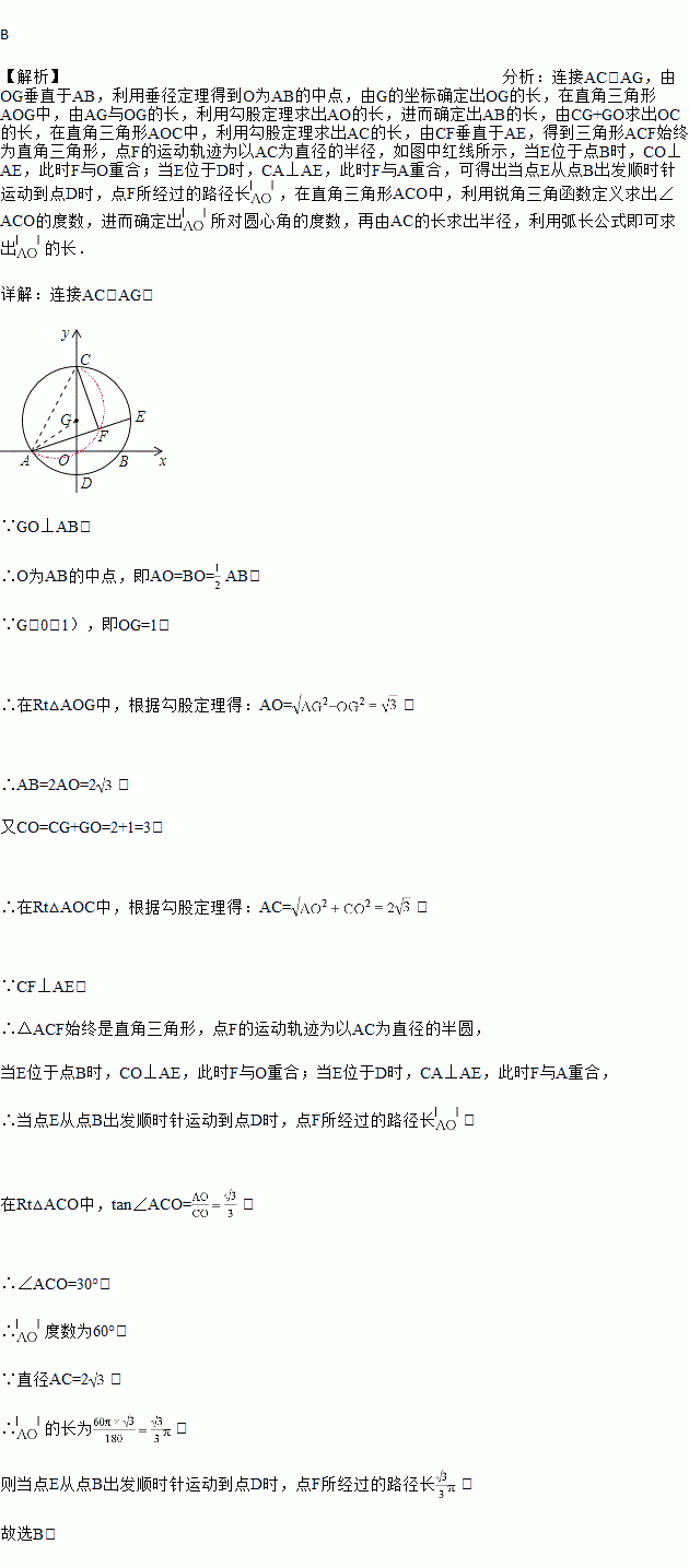 如图,以G(0,1)为圆心,半径为2的圆与x轴交于A、B两点,与y轴交于C、D两点,点E为⊙G上一动点,CF⊥AE于F.当点E从点B出发顺时针运动到点D时,点F所经过的路径长为( )