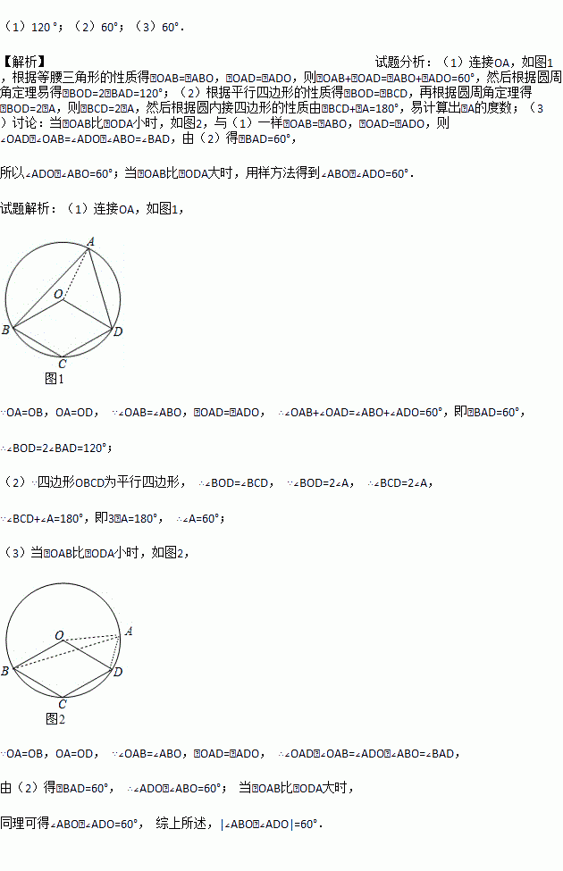 (3)当圆心O在∠BAD外部,四边形OBCD为平行四边形时,请直接写出∠ABO与∠ADO的数量关系.