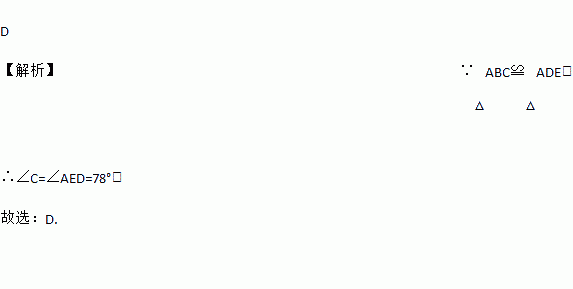 D 【解析】∵△ABC≌△ADE, ∴∠C=∠AED=78°; 故选:D.
