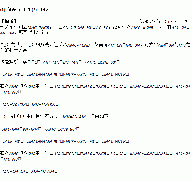 (1) 答案见解析;(2) 不成立 【解析】试题分析:(1)利用互余关系证明∠MAC=∠NCB,又∠AMC=∠CNB=90°,AC=BC,故可证△AMC≌△CNB,从而有AM=CN,MC=BN,即可得出结论; (2)类似于(1)的方法,证明△AMC≌△CNB,从而有AM=CN,MC=BN,可推出AM、BN与MN之间的数量关系. 试题解析:解:(1)∵AM⊥MN,BN⊥MN,∴∠A...