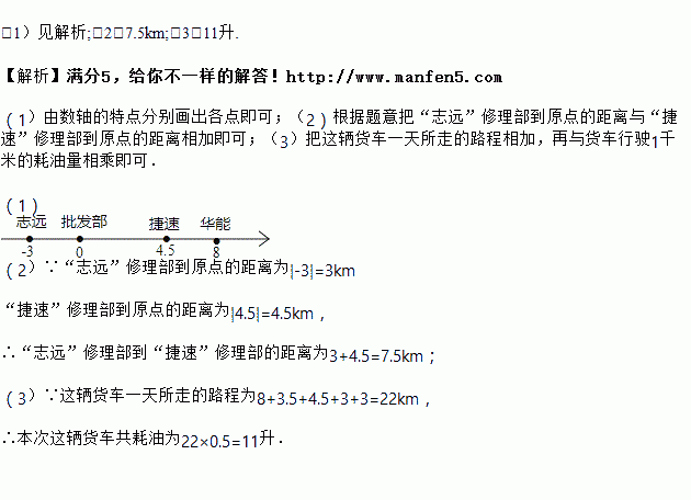 一辆货车为一家摩托车配件批发部送货,先向南走了8km到达“华能”修理部,又向北走了3.5km到达“捷速”修理部,继续向北走了7.5km到达“志远”修理部,最后又回到了批发部.