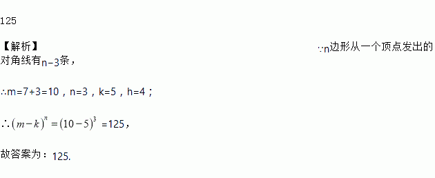 125 【解析】∵n边形从一个顶点发出的对角线有n?3条, ∴m=7+3=10,n=3,k=5,h=4; ∴=125, 故答案为:125.
