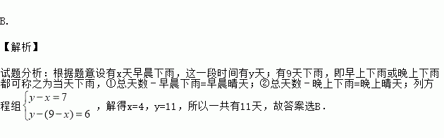 某气象台发现:在某段时间里,如果早晨下雨,那么晚上是晴天;如果晚上下雨,那么早晨是晴天,已知这段时间有9天下了雨,并且有6天晚上是晴天,7天早晨是晴天,则这一段时间有( )