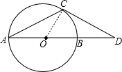 如图,点D在⊙O的直径AB的延长线上,点C在⊙O上,AC=CD,∠D=30°.