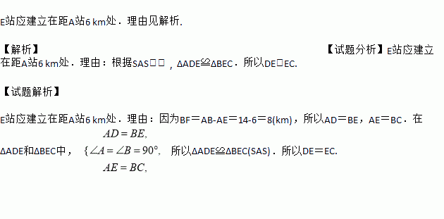 如图所示,铁路上A,B两站(视为直线上两点)相距14 km,C,D为两村 (可视为两个点),DA⊥AB于A,CB⊥AB于B,已知DA=8 km,CB=6 km,现在要在铁路上建一个土特产品收购站E,使C,D两村到正站的距离相等,则E站应建在距A站多少千米处?