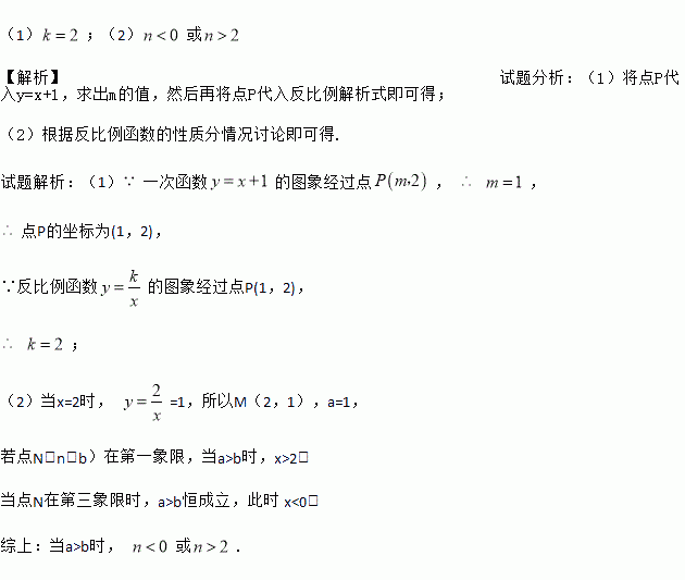(1);(2)或 【解析】试题分析:(1)将点P代入y=x+1,求出m的值,然后再将点P代入反比例解析式即可得; (2)根据反比例函数的性质分情况讨论即可得. 试题解析:(1)一次函数的图象经过点, , 点P的坐标为(1,2), ∵反比例函数的图象经过点P(1,2), ; (2)当x=2时, =1,所以M(2,1),a=1, 若点N(n,b)在第一象...