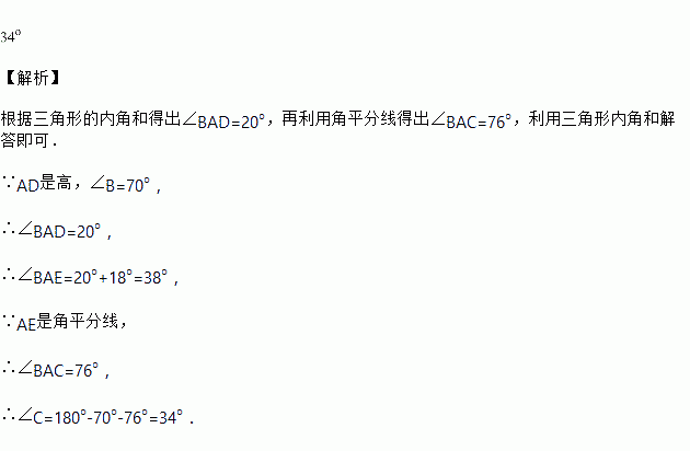 如图,在△ABC中,AD是BC边上的高,AE是∠BAC的平分线,∠B=70°,∠DAE=18°,求∠C的度数.