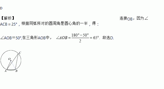 如图,A,B,C是⊙O上三点,∠ACB=25°,则∠BAO的度数是( )
