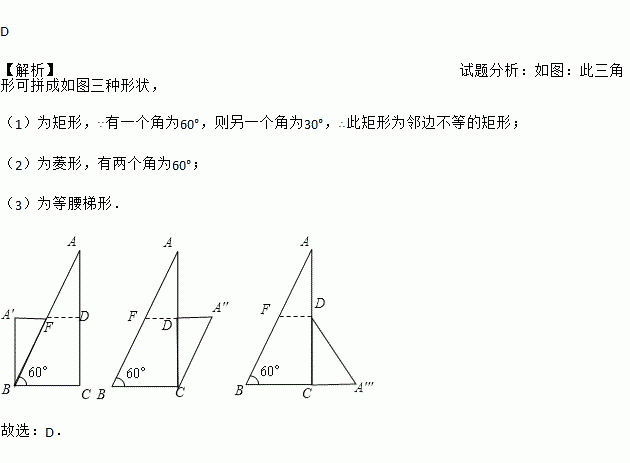 D 【解析】试题分析:如图:此三角形可拼成如图三种形状, (1)为矩形,∵有一个角为60°,则另一个角为30°,∴此矩形为邻边不等的矩形; (2)为菱形,有两个角为60°; (3)为等腰梯形. 故选:D.