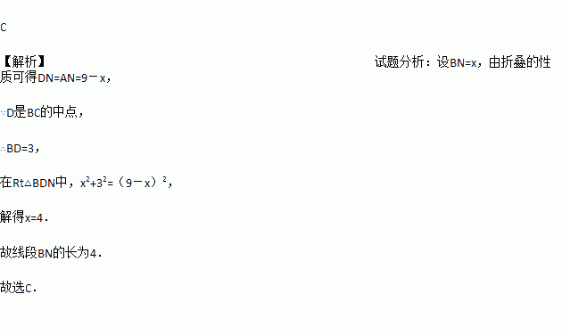 如图,Rt△ABC中,AB=9,BC=6,∠B=90°,将△ABC折叠,使A点与BC的中点D重合,折痕为MN,则线段BN的长为( )