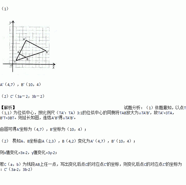 (1)以点T(1,1)为位似中心,按比例尺(TA′∶TA)3∶1在位似中心的同侧将△TAB放大为△TA′B′,放大后点A、B的对应点分别为A′、B′.画出△TA′B′,并写出点A′、B′的坐标;