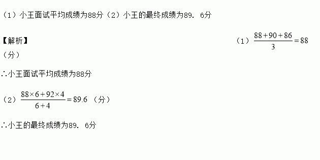 (2)如果面试平均成绩与笔试成绩按6:4的比确定,请计算出小王的最终成绩.