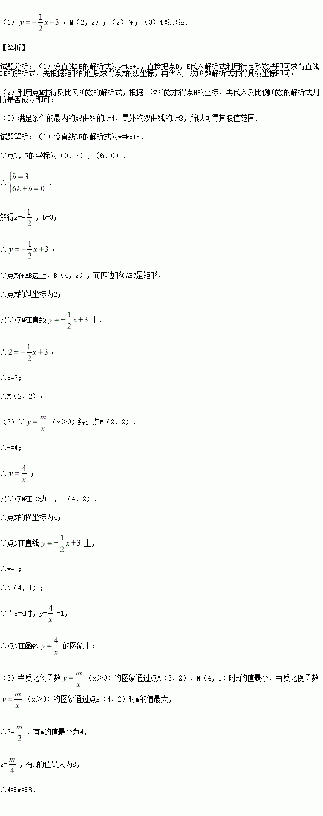 如图,在直角坐标系中,矩形OABC的顶点O与坐标原点重合,顶点A,C分别在坐标轴上,顶点B的坐标为(4,2).过点D(0,3)和E(6,0)的直线分别与AB,BC交于点M,N.