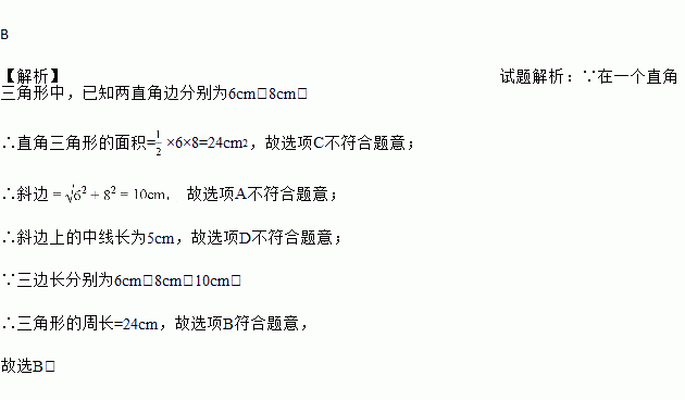 在一个直角三角形中,已知两直角边分别为6cm,8cm,则下列结论不正确的是( )