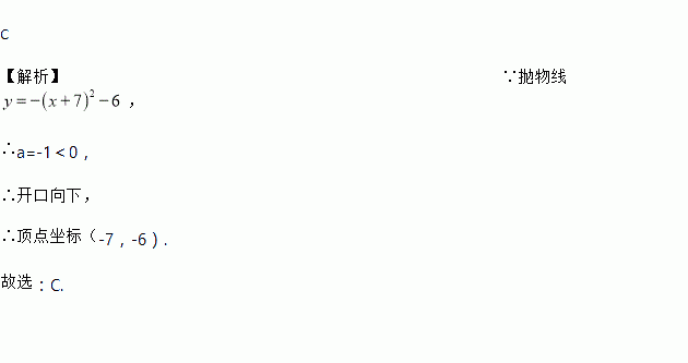 C 【解析】∵抛物线, ∴a=-1<0, ∴开口向下, ∴顶点坐标(-7,-6). 故选:C.