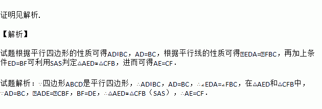 如图,点E,F是平行四边形ABCD对角线BD上的点,且BF=DE.求证:AE=CF.