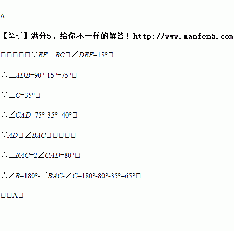 如图,在△ABC中,AD是∠BAC的平分线,E为AD上一点,且EF⊥BC于点F.若∠C=35°,∠DEF=15°,则∠B的度数为( )