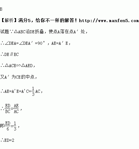 (2011•河北)如图,在△ABC 中,∠C=90°,BC=6,D,E 分别在 AB、AC上,将△ABC沿DE折叠,使点A落在点A′处,若A′为CE的中点,则折痕DE的长为( )