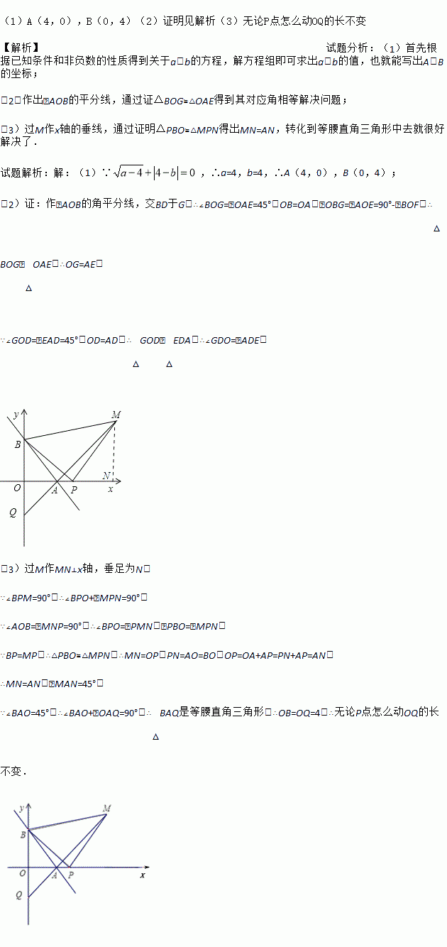 (3)如图,P为x轴上A点右侧任意一点,以BP为边作等腰Rt△PBM,其中PB=PM,直线MA交y轴于点Q,当点P在x轴上运动时,线段OQ的长是否发生变化?若不变,求其值;若变化,求线段OQ的取值范围.