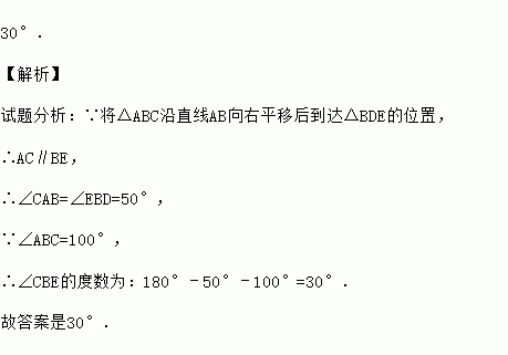 如图,将三角形纸板ABC沿直线AB平移,使点A移到点B,若∠CAB=50°,∠ABC=100°,则∠CBE的度数为____ ____.