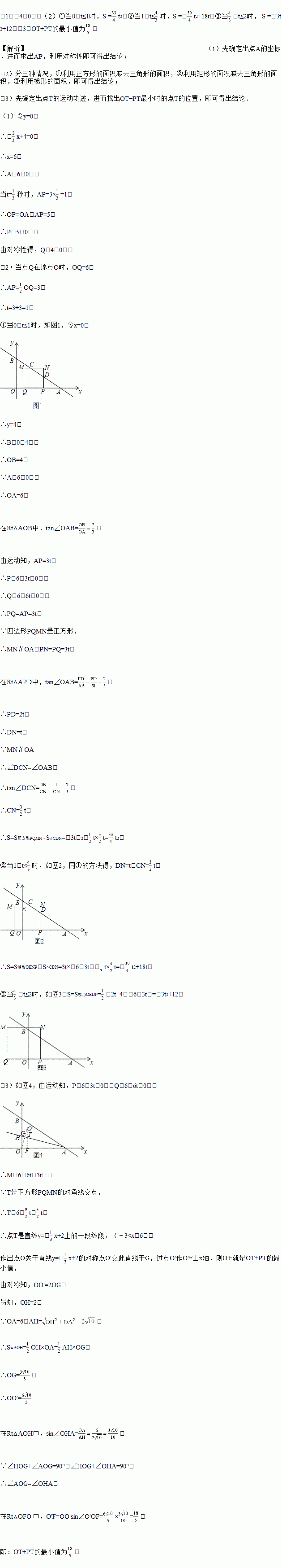 (3)若正方形PQMN对角线的交点为T,请直接写出在运动过程中OT+PT的最小值.