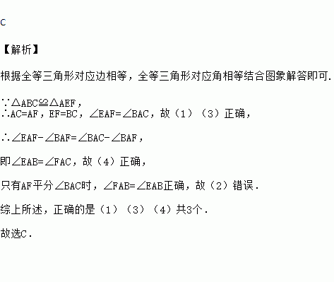 如图所示,△ABC ≌△AEF,AB=AE,∠B=∠E,有以下结论:①AC=AF;②∠FAB=∠EAB;③EF=BC;④∠EAB=∠FAC,其中正确的个数是 ( )