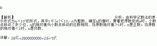 据国家新闻出版广电总局电影局数据,2017年国庆中秋节假期全国城市影院电影票房约26亿元,总票房创下该档期新纪录,26亿用科学记数法表示正确的是 ( )