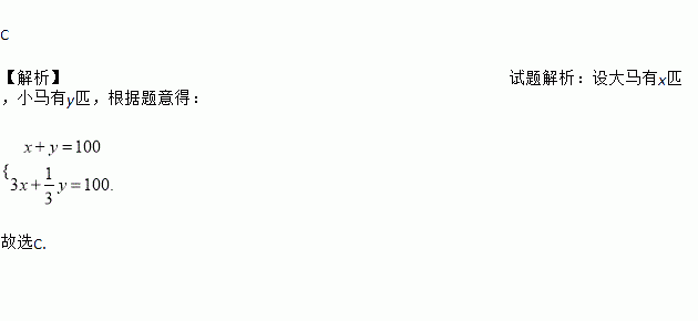 (2017·承德兴隆县期末)我国古代数学名著《孙子算经》中记载了一道题,大意是:100匹马恰好拉了100片瓦,已知1匹大马能拉3片瓦,3匹小马能拉1片瓦,问有多少匹大马、多少匹小马?若设大马有x匹,小马有y匹,则可列方程组为( )
