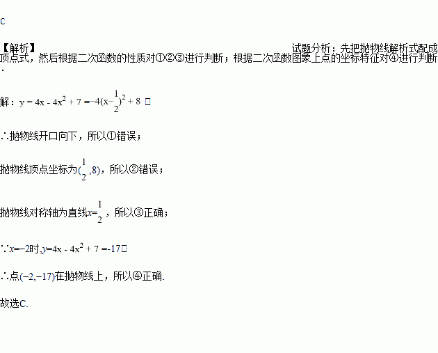 对于抛物线,有下列说法:①抛物线的开口向上;②顶点坐标为(2,﹣3);③对称轴为直线;④点(﹣2,-17)在抛物线上.其中正确的有( )