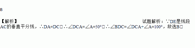 (2016湖北省黄石市)如图所示,线段AC的垂直平分线交线段AB于点D,∠A=50°,则∠BDC=( )