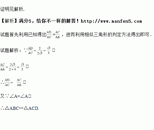 如图所示,点D在△ABC的AB边上,AD=2,BD=4,AC=2.求证:△ACD∽△ABC.