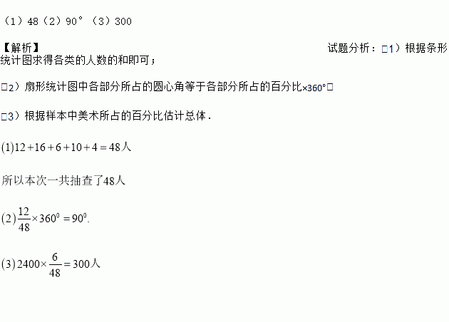 (1)48(2)90°(3)300 【解析】试题分析:(1)根据条形统计图求得各类的人数的和即可; (2)扇形统计图中各部分所占的圆心角等于各部分所占的百分比×360°; (3)根据样本中美术所占的百分比估计总体.