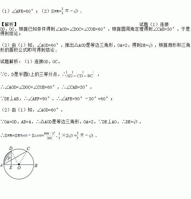 如图,C、D是半圆O上的三等分点,直径AB=4,连接AD、AC,DE⊥AB,垂足为E,DE交AC于点F.