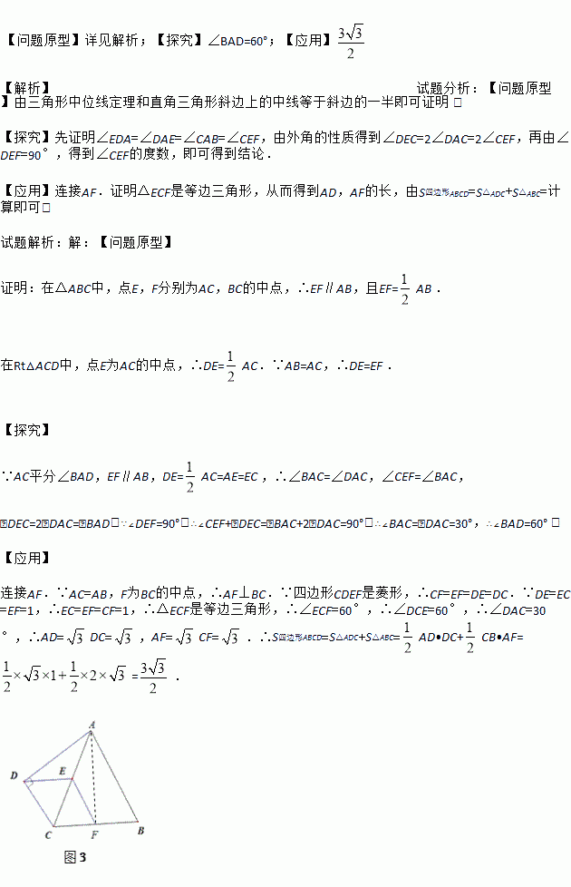【探究】如图2,在问题原型的条件下,当AC平分∠BAD,∠DEF=90°时,求∠BAD的大小.