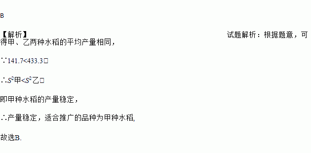 某村引进甲乙两种水稻良种,各选6块条件相同的实验田,同时播种并核定亩产,结果甲、乙两种水稻的平均产量均为550kg/亩,方差分别为